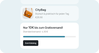 Mit Pushly kannst du Produkte per Fingertipp direkt in den Warenkorb legen. Wiederkehrende Bestellungen gehen schnell, und der Versandkostenmotivator zeigt, wie viel bis zum Gratisversand fehlt – das steigert den Warenkorbwert.